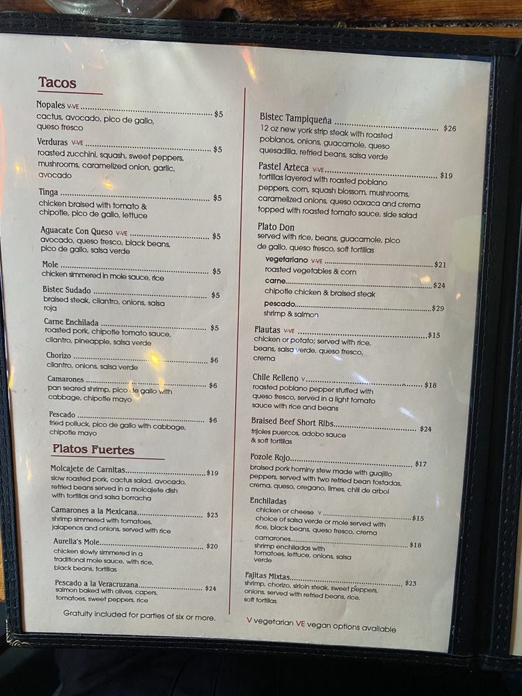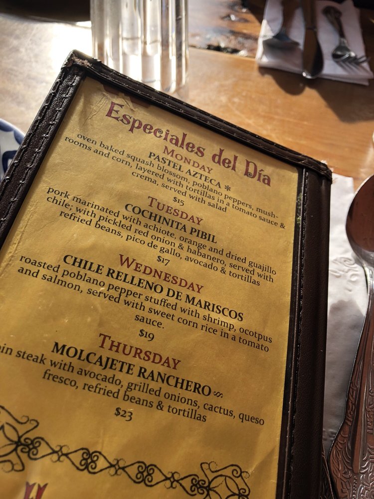 Tortillas simmered in a choice of salsa verde or mole, served with 2 fried eggs, queso fresco, crema and refried beans.