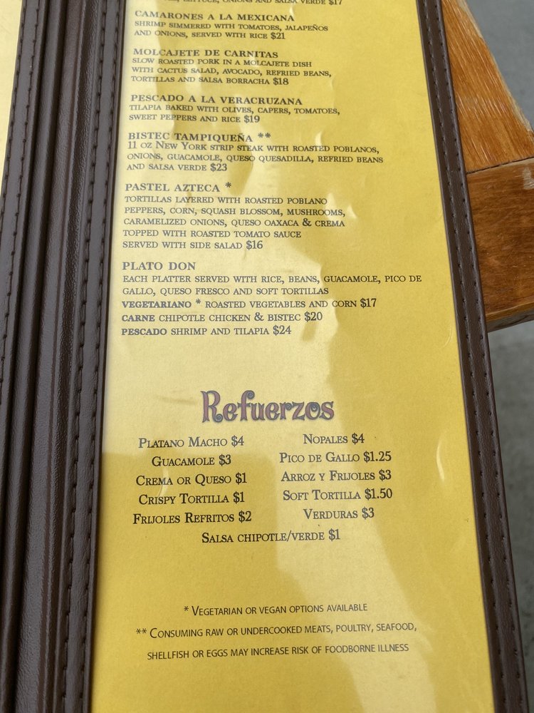 12oz Sirloin steak with roasted poblanos, onions,guacamole, queso quesadilla, refried beans and salsa verde.